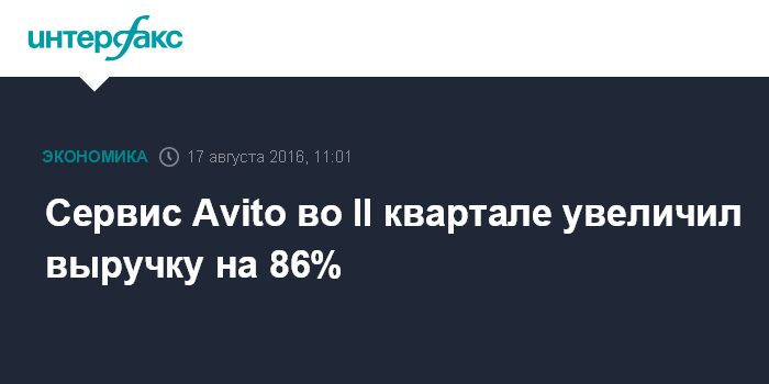 Москва. 17 августа. INTERFAX.RU - Интернет-сервис объявлений Avito во II квартале 2016 года увеличил выручку на 86% по сравнению с аналогичным показателем годом ранее, до 2,93 млрд рублей, говорится в сообщении совладельца компании, шведского инвестфонда Vostok New Ventures.