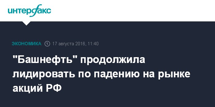 Москва. 17 августа. INTERFAX.RU - Рынок акций РФ утром в среду просел вслед за мировыми фондовыми площадками и нефтью, лидерами падения и по объемам торгов выступают акции "Башнефти", которые рухнули в первые минуты торгов на 12% на новостях об отсрочке приватизации компании, после чего стабилизировались на достигнутых уровнях.
