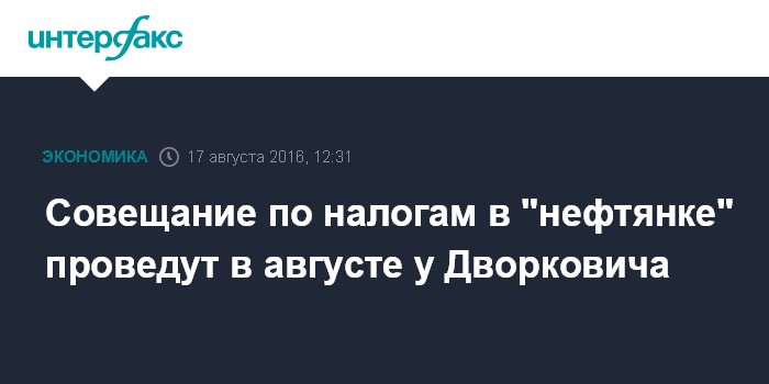 Москва. 17 августа. INTERFAX.RU - Совещание по налогообложению нефтяной отрасли у курирующего вице-премьера Аркадия Дворковича состоится в августе, заявил первый замминистра энергетики РФ Алексей Текслер.
