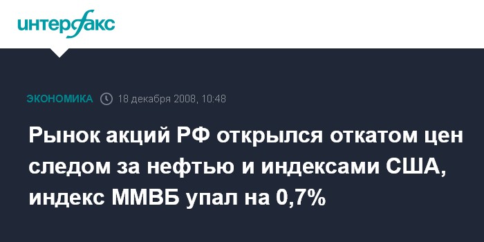 Москва. 18 декабря. INTERFAX.RU - Российский рынок акций открылся в четверг откатом цен blue chips следом за упавшими накануне нефтью и индексами в США, индекс ММВБ в первую минуту торгов упал на 0,7%.