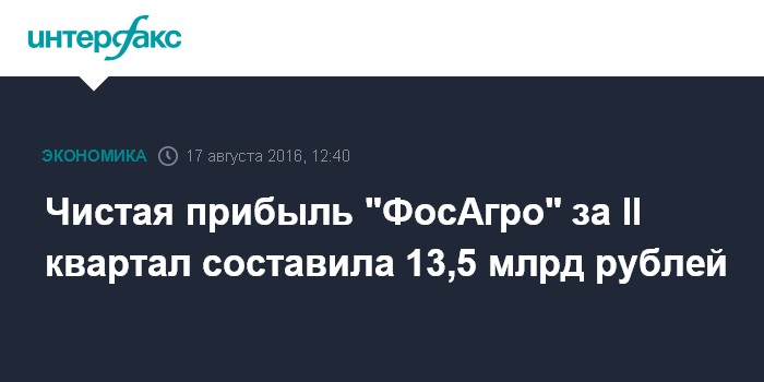 Москва. 17 августа. INTERFAX.RU - Чистая прибыль "ФосАгро" за второй квартал составила 13,5 млрд рублей, оставшись на уровне апреля-июня прошлого года. Аналитики, опрошенные "Интерфаксом", прогнозировали EBITDA компании за отчетный период в размере 17,3 млрд рублей, чистую прибыль - 14,24 млрд рублей.
