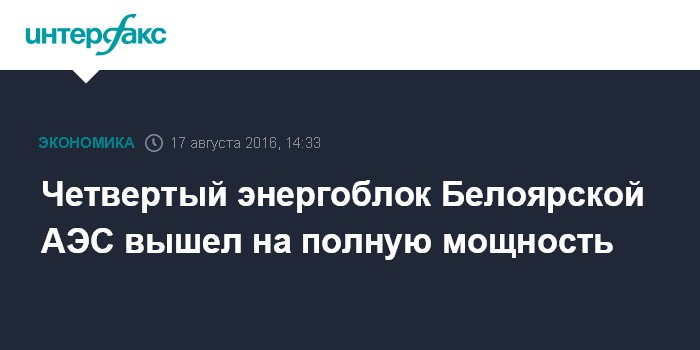 Москва. 17 августа. INTERFAX.RU - Энергоблок N4 Белоярской АЭС с реактором на быстрых нейтронах БН-800 в среду приступил к работе на 100% мощности, сообщили "Интерфаксу" в АО "Концерн "Росэнергоатом".