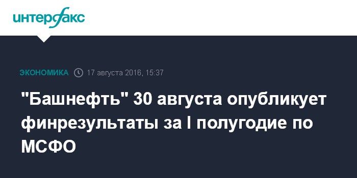 Москва. 17 августа. INTERFAX.RU - "Башнефть" 30 августа опубликует финансовые результаты I полугодия 2016 года по МСФО, сообщается на сайте компании.