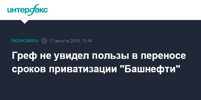 Москва. 17 августа. INTERFAX.RU - Глава Сбербанка России Герман Греф считает, что перенос сроков приватизации "Башнефти" является не позитивным сигналом для инвесторов.