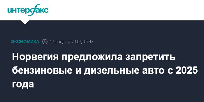Москва. 17 августа. INTERFAX.RU - Норвегия планирует запретить автомобили с бензиновыми и дизельными двигателями.