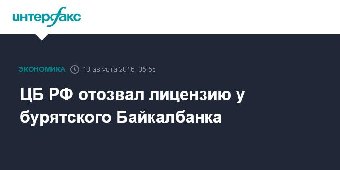 Москва. 18 августа. INTERFAX.RU - Центральный банк РФ отозвал лицензию на осуществление банковских операций у бурятского Байкалбанка, говорится в сообщении ЦБ.