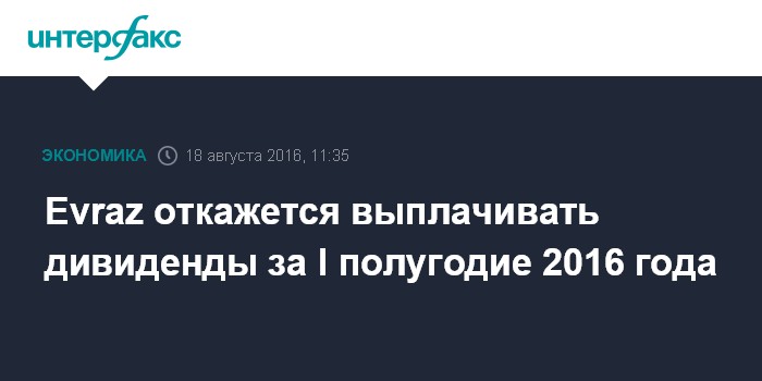 Москва. 18 августа. INTERFAX.RU - Evraz не планирует выплачивать дивиденды по итогам первого полугодия 2016 года, сообщил журналистам и.о. вице-президента компании по финансам Джакомо Байзини в ходе телефонной конференции.