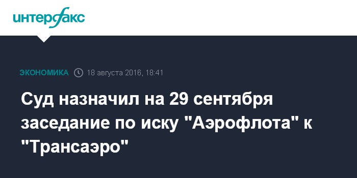 Москва. 18 августа. INTERFAX.RU - Арбитражный суд Москвы в четверг назначил на 29 сентября основное заседание по иску ПАО "Аэрофлот - российские авиалинии" о взыскании с ОАО "Авиационная компания "Трансаэро" 429,2 млн рублей.