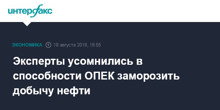 Москва. 18 августа. INTERFAX.RU - Заморозка добычи странами ОПЕК маловероятна из-за разногласий между отдельными государствами и конкуренции за долю рынка, приводит агентство Bloomberg мнение различных аналитиков.