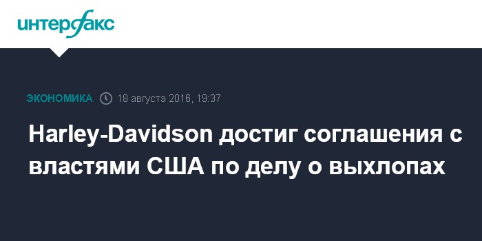 Москва. 18 августа. INTERFAX.RU - Производитель мотоциклов Harley-Davidson Inc. достиг соглашения с властями США по делу о продаже устройств, способных повышать мощность двигателей, при этом увеличивая выбросы вредных веществ в атмосферу, сообщает CNBC.