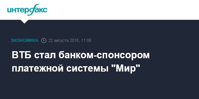 Первым участником "Мира" под спонсорством ВТБ стала его "дочка" - Почта банк, указано в пресс-релизе. "Теперь Почта банк, ежедневно расширяющий свою филиальную сеть, сможет уже в ближайшее время обеспечить прием и начать эмиссию карт "Мир", - отметил гендиректор Национальной системы платежных карт (НСПК) Владимир Комлев.