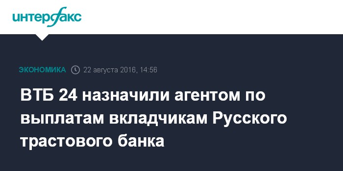 ВТБ 24 назначили агентом по выплатам вкладчикам Русского трастового банка