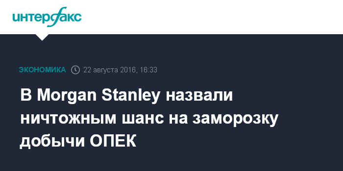 Москва. 22 августа. INTERFAX.RU - Вероятность заключения соглашения об ограничении добычи странами ОПЕК "очень мала", поскольку эти государства ведут борьбу за долю рынка, полагают эксперты Morgan Stanley.