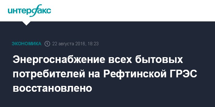 Москва. 22 августа. INTERFAX.RU - Всем бытовым потребителям подано напряжение после ЧС на Рефтинской ГРЭС, сообщило Минэнерго РФ.