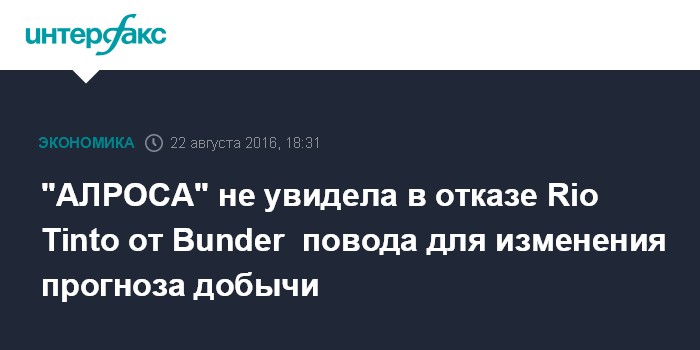 "Ожидания компании подтвердились решением Rio Tinto о выходе из проекта и закрытием его инфраструктуры к окончанию 2016 г. Таким образом, отказ Rio Tinto от развития проекта Bunder не повлияет на прогноз "АЛРОСА" в части предложения алмазного сырья на мировой рынок из добычи", - заявил собеседник "Интерфакса".