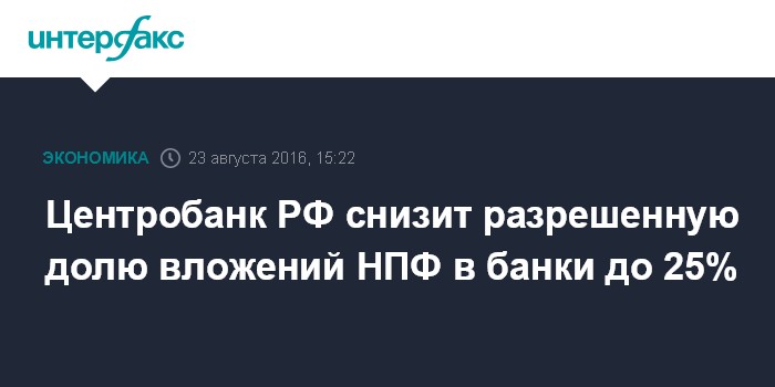 Центробанк РФ снизит разрешенную долю вложений НПФ в банки до 25%