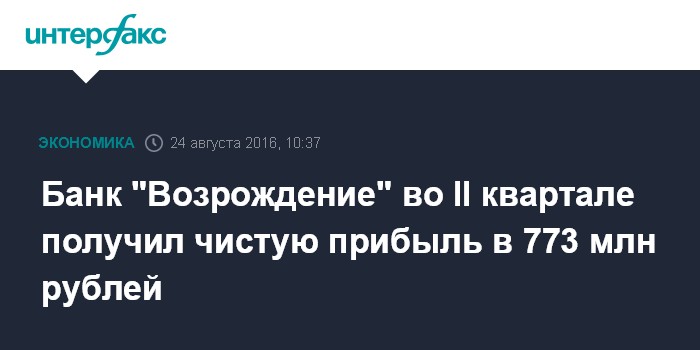 Москва. 24 августа. INTERFAX.RU - Банк "Возрождение" во втором квартале 2016 года получил чистую прибыль по МСФО в размере 773 млн рублей по сравнению с чистым убытком 609 млн рублей за аналогичный период 2015 года.