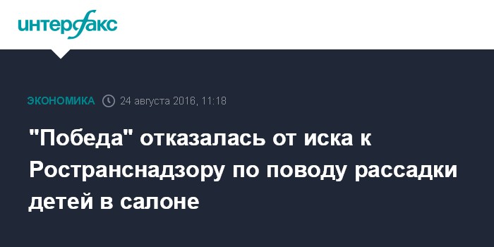 Москва. 24 августа. INTERFAX.RU - ООО "Авиакомпания "Победа" (входит в группу "Аэрофлот") отказалось от требований о признании недействительным и отмене предписания Федеральной службы по надзору в сфере транспорта (Ространснадзор) от 29 февраля 2016 года, касающегося совместного размещения детей с родителями в салоне самолета.