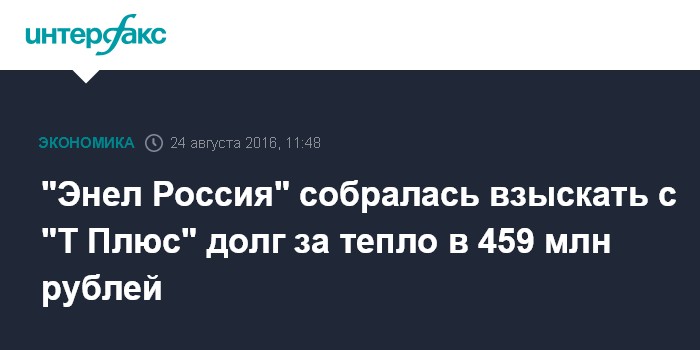 Точная сумма исковых требований составляет 458 млн 903 тыс. 928 руб. Как пояснили "Интерфаксу" в "Энел Россия", "задолженность образовалась в связи с неисполнением ПАО "Т Плюс" обязательств по оплате тепловой энергии и теплоносителя, поставленных должнику в период с апреля 2016 года по июнь 2016 года". В пресс-службе "Т Плюс", в свою очередь, отметили, что компания еще не получила исковое заявление. "Т Плюс" предпринимает усилия по погашению возникшей задолженности", - сказали в компании.