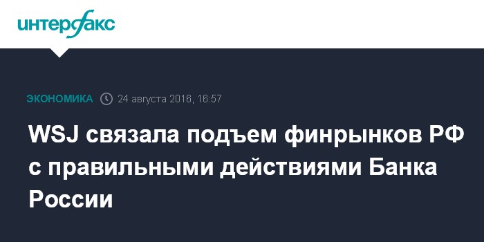 Москва. 24 августа. INTERFAX.RU - Российские финансовые рынки восстанавливаются в 2016 году, что, по мнению многих инвесторов, происходит благодаря правильным действиям ЦБ РФ и его главы Эльвиры Набиуллиной, пишет газета The Wall Street Journal.