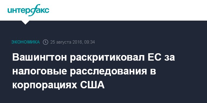 Москва. 25 августа. INTERFAX.RU - Минфин США считает, что Европейская комиссия в ходе расследования внутригрупповых сделок Apple и других мультинациональных корпораций нарушает международные налоговые нормы и сложившийся статус-кво в области трансфертного ценообразования.