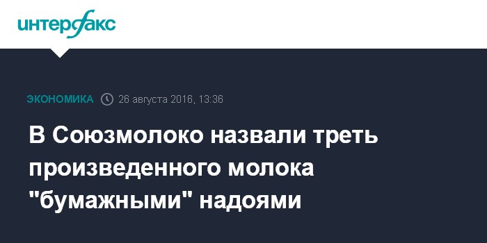 Москва. 26 августа. INTERFAX.RU - Около трети объема официально производимого молока в России являются "бумажными" надоями, заявил председатель правления Национального союза производителей молока (Союзмолоко) Андрей Даниленко на пресс-конференции в Уфе в пятницу.