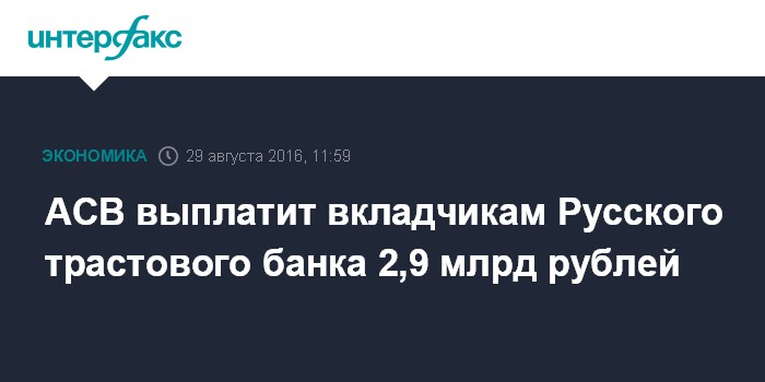 Москва. 29 августа. INTERFAX.RU - Агентство по страхованию вкладов (АСВ) оценивает объем страхового возмещения вкладчикам Русского трастового банка на сумму 2,9 млрд рублей, выплаты начнутся 30 августа, говорится в сообщении АСВ.