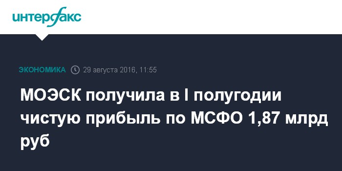Москва. 29 августа. INTERFAX.RU - ПАО "МОЭСК" получило в январе-июне чистую прибыль по МСФО в размере 1,87 млрд руб. против прибыли в 5,58 млрд руб. годом ранее, следует из отчетности компании.