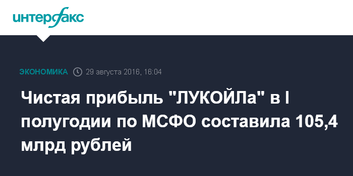 Москва. 29 августа. INTERFAX.RU - Чистая прибыль НК "ЛУКОЙЛ" в первом полугодии 2016 года по МСФО составила 105,4 млрд рублей, следует из отчета компании.