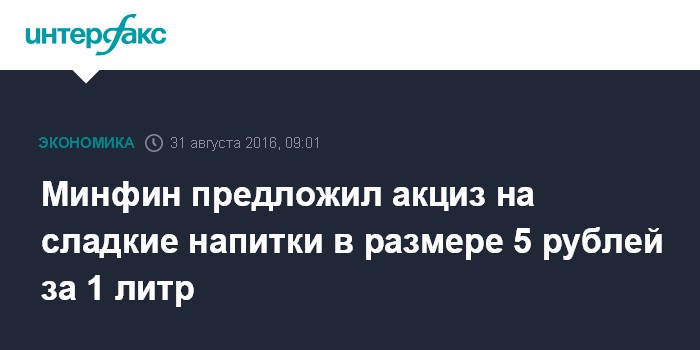 Москва. 31 августа. INTERFAX.RU - Минфин предложил ввести акциз на напитки с добавлением сахара и/или других подслащивающих и вкусоароматических веществ в размере 5 рублей за 1 литр, пишет газета "Ведомости". Инициатива содержится в материалах к совещанию о дополнительных доходах в бюджет на 2017–2019 гг., которое прошло у вице-премьера Игоря Шувалова ранее на этой неделе.