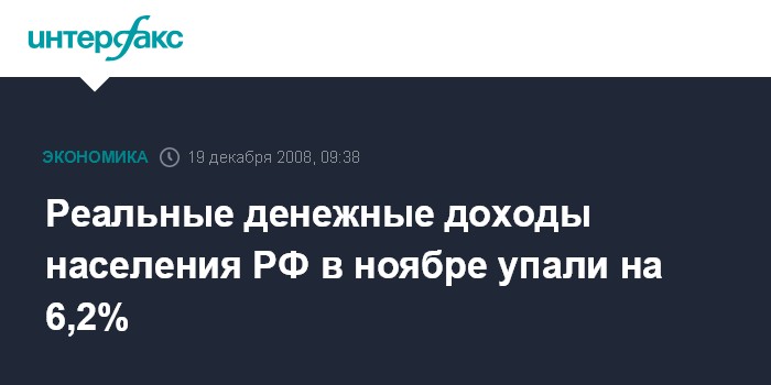 Москва. 19 декабря. INTERFAX.RU - Реальные располагаемые денежные доходы населения России упали в ноябре 2008 года на 6,2% по сравнению с аналогичным месяцем прошлого года, сообщила в пятницу Федеральная служба госстатистики РФ (Росстат).