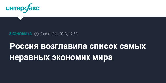 Москва. 2 сентября. INTERFAX.RU - Россия заняла первое место в списке стран с самым высоким уровнем неравенства среди основных экономик мира, свидетельствуют результаты исследования консалтинговой компании New World Wealth.