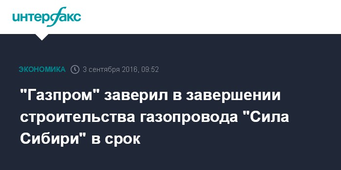 Москва. 3 сентября. INTERFAX.RU - "Газпром" подтверждает планы завершить строительство газопровода в Китай в срок и синхронизировать его запуск с готовностью объектов с китайской стороны.