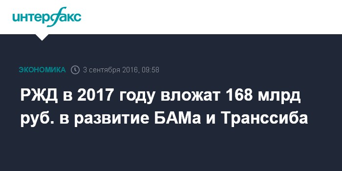 Москва. 3 сентября. INTERFAX.RU - ОАО "РЖД" в 2017 году вложит 168 млрд рублей в развитие Байкало-Амурской и Транссибирской магистралей, сообщил первый вице-президент монополии Александр Мишарин на Восточном экономическом форуме в субботу.