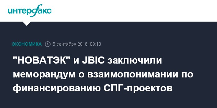 Москва. 5 сентября. INTERFAX.RU - "НОВАТЭК" и Японский банк международного сотрудничества (JBIC) заключили меморандум о взаимопонимании в области стратегического партнерства, сообщила российская компания.