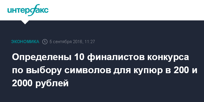 Москва. 5 сентября. INTERFAX.RU - Банк России объявил 10 финалистов конкурса по выбору символов для новых банкнот достоинством 200 и 2000 рублей, за которые жители страны отдали наибольшее количество голосов в рамках второго этапа отбора, сообщает пресс-служба Дальневосточного главного управления Банка России.