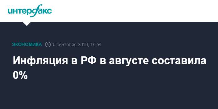 Москва. 5 сентября. INTERFAX.RU - Инфляция в РФ в августе 2016 года составила 0% после 0,5% в июле, 0,4% в июне-апреле, 0,5% в марте, 0,6% в феврале и 1% в январе, сообщил в понедельник Росстат.