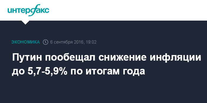 Москва. 6 сентября. INTERFAX.RU - Инфляция в России в 2016 году снизится до 5,7-5,9% с 12,9% в 2015 году, заявил президент РФ Владимир Путин во вторник на встрече с "Единой Россией" и экспертами.
