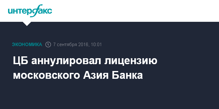 Москва. 7 сентября. INTERFAX.RU - Банк России аннулировал лицензию на осуществление банковских операций у Азия Банка (Москва), говорится в сообщении регулятора.