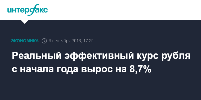 Москва. 8 сентября. INTERFAX.RU - В январе-августе 2016 года реальный эффективный курс рубля к корзине валют государств - основных торговых партнеров России вырос на 8,7%, согласно предварительной оценке ЦБ РФ, опубликованной на его сайте.