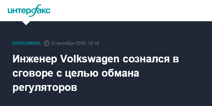 Москва. 9 сентября. INTERFAX.RU - Инженер Volkswagen AG Джеймс Лян признал вину в преступном сговоре с целью обмана регуляторов и потребителей относительно уровня выбросов в автомобилях с дизельными двигателями, сообщает агентство Bloomberg.