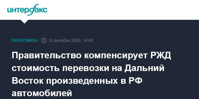 Москва. 19 декабря. INTERFAX.RU - Правительство будет полностью компенсировать РЖД стоимость перевозки на Дальний Восток произведенных в РФ новых автомобилей, заявил премьер-министр РФ Владимир Путин на совещании о дополнительных мерах по стабилизации ситуации в автомобильной промышленности в пятницу в Набережных Челнах.