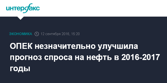 Москва. 12 сентября. INTERFAX.RU - Организация стран-экспортеров нефти незначительно улучшила прогноз мирового спроса на нефть в 2016-2017 годах, говорится в ежемесячном обзоре картеля.