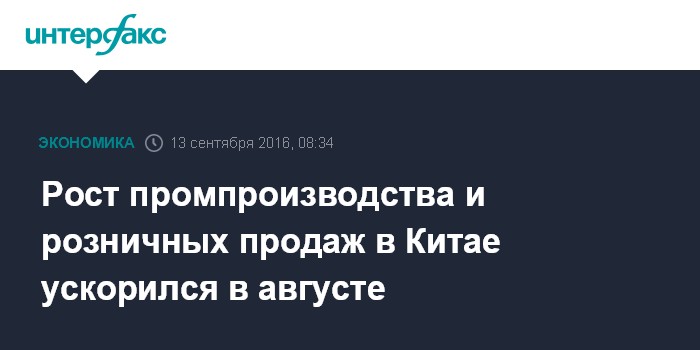 Москва. 13 сентября. INTERFAX.RU - Темпы роста промышленного производства и розничных продаж в Китае ускорились в августе и превысили прогнозы рынка, что добавляет оптимизма в отношении ситуации в китайской экономике, свидетельствуют обнародованные во вторник данные Государственного статистического управления КНР.