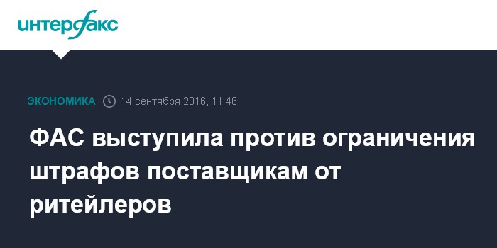 Москва. 14 сентября. INTERFAX.RU - Федеральная антимонопольная служба (ФАС) РФ выступает против ограничения размера штрафов, которые ритейлеры могут взимать с поставщиков, но допускает, что регулирование понадобится, если ритейлеры будут злоупотреблять своей рыночной силой.