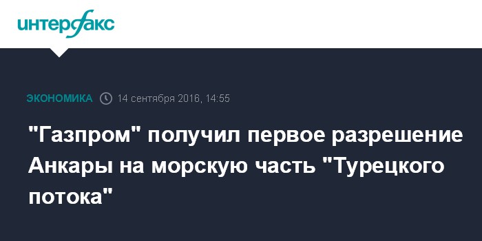 Москва. 14 сентября. INTERFAX.RU - "Газпром" по дипломатическим каналам получил первое разрешение органов власти Турции на строительство морского участка газопровода "Турецкий поток", говорится в сообщении компании.