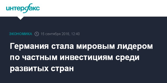 Москва. 15 сентября. INTERFAX.RU - Германия стала лидером среди промышленно развитых стран по объему частных инвестиций - в 2015 году вложения частного капитала в экономику страны составили почти 18% ВВП, сообщает Deutsche Welle (DW).
