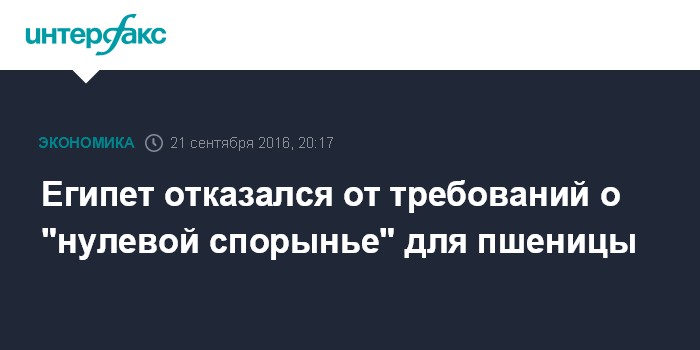 Москва. 21 сентября. INTERFAX.RU - Египет в среду вновь изменил правила импорта зерновых: министерства сельского хозяйства и мелиорации страны приняло решение отказаться от требования о "нулевой спорынье" (т.е. от запрета на ввоз пшеницы с содержанием спорыньи выше 0%).