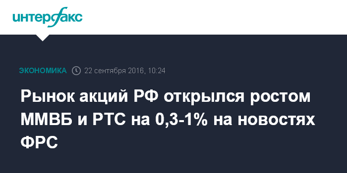 Москва. 22 сентября. INTERFAX.RU - Рынок акций РФ открылся в четверг ростом цен blue chips вслед за подъемом мировых площадок на новостях от Федрезерва США, сохранившего неизменной денежно-кредитную политику; индексы ММВБ и РТС за минуту торгов прибавили 0,3-1%, причем индекс ММВБ вновь превысил рубеж 2000 пунктов.