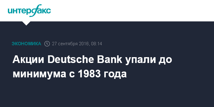 Москва. 27 сентября. INTERFAX.RU - Акции Deutsche Bank AG рухнули в понедельник на 7,5%, достигнув минимального уровня с 1983 года, из-за обеспокоенности рынка финансовым состоянием кредитной организации. В понедельник банк опроверг появившуюся в СМИ информацию, что он хотел бы получить помощь правительства Германии, чтобы сократить сумму финансовых претензий со стороны регулятора в США, но получил отказ.